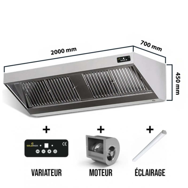 Dotée d’une structure monobloc compacte et robuste, cette hotte est équipée d’un moteur performant avec protection thermique, d’un variateur de vitesse intégré et d’un éclairage résistant aux hautes températures, assurant ainsi un confort optimal d’utilisation au quotidien. Tous ces composants sont déjà montés en usine, permettant une installation simple, rapide et sans complications dès la livraison.