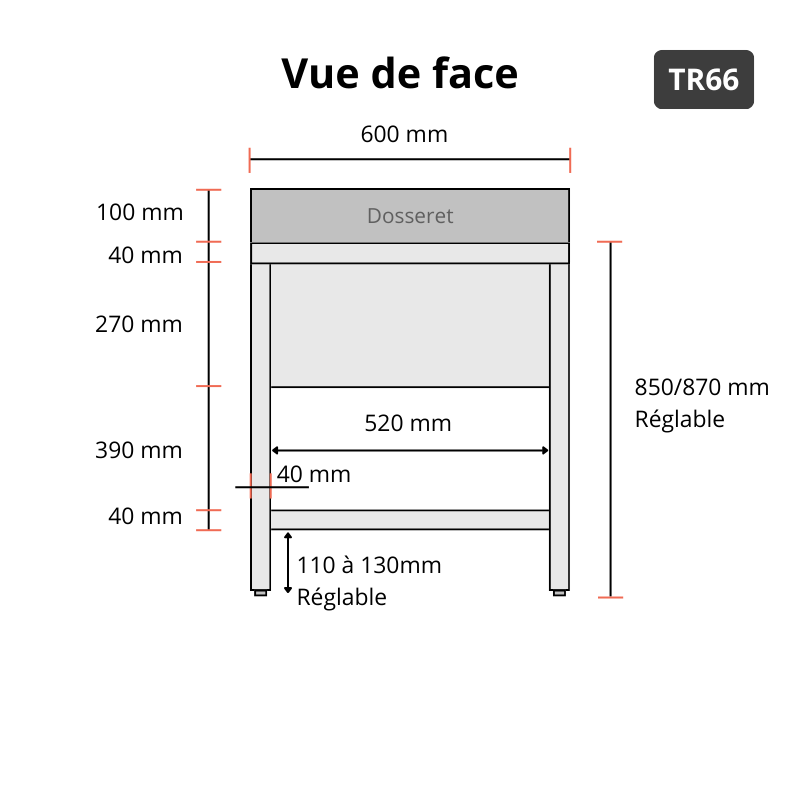 Les angles arrondis renforcent la sécurité et empêchent l’accumulation de saletés, permettant un entretien plus rapide et hygiénique. L’étagère basse intégrée offre un espace de rangement pratique pour garder à portée de main ustensiles, bacs ou produits d’entretien, optimisant ainsi l’organisation de votre poste de travail.