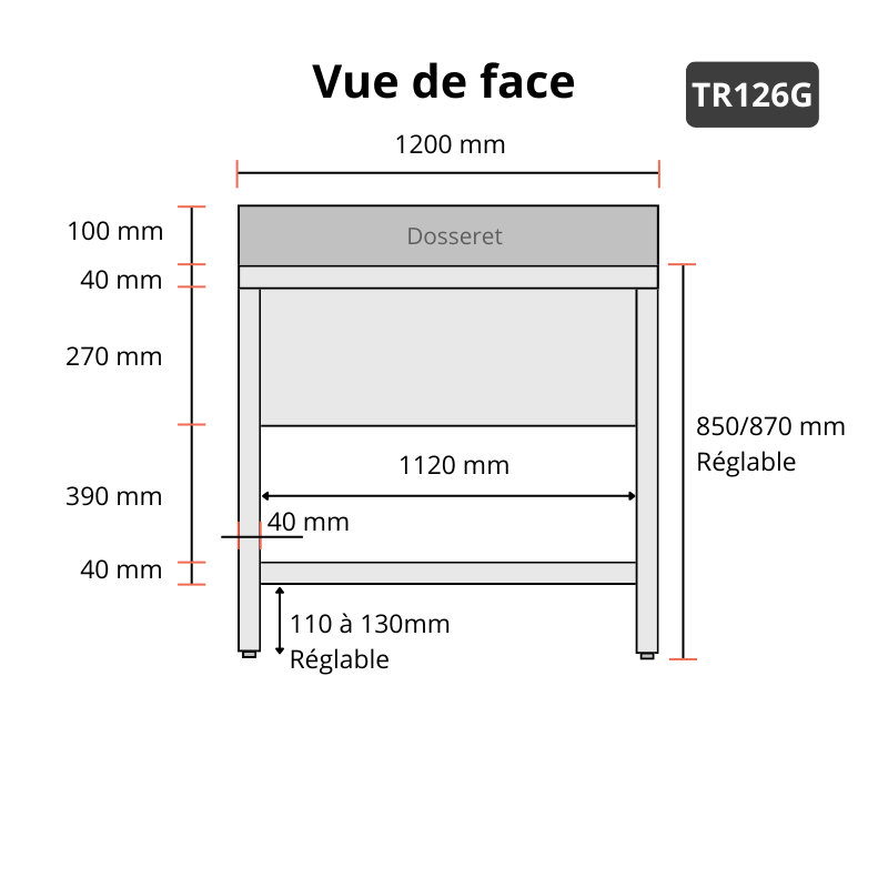 - Dimensions extérieures : 1200 x 600 x 850/870 mm