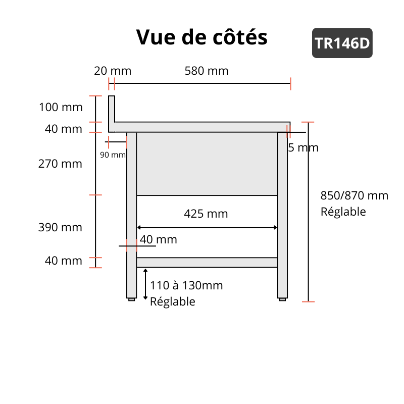- Hauteur réglable pour les pieds : 850 à 870 mm