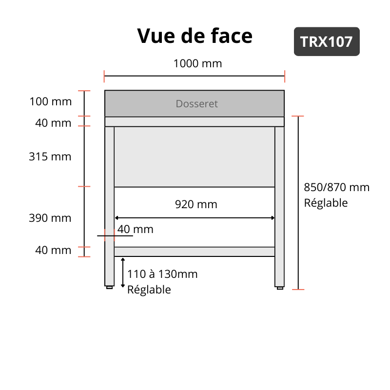- Dimensions extérieures : 1000 x 700 x 850/870 mm