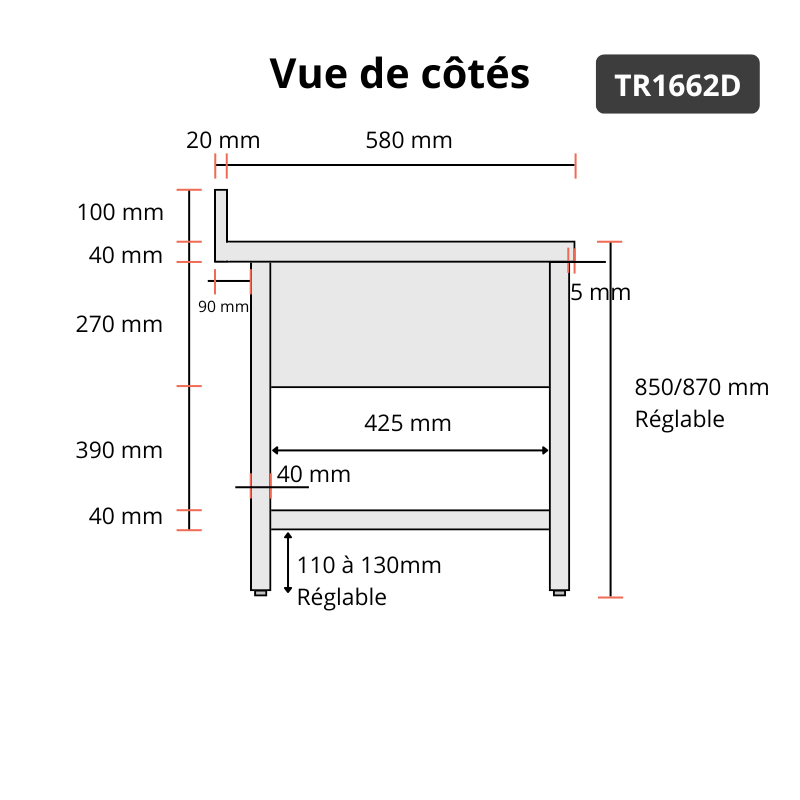 - Hauteur réglable pour les pieds : 850 à 870 mm