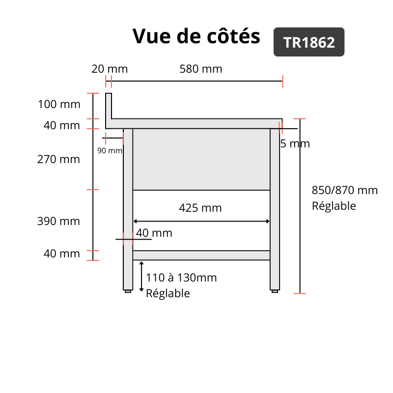 - Hauteur réglable pour les pieds : 850 à 870 mm