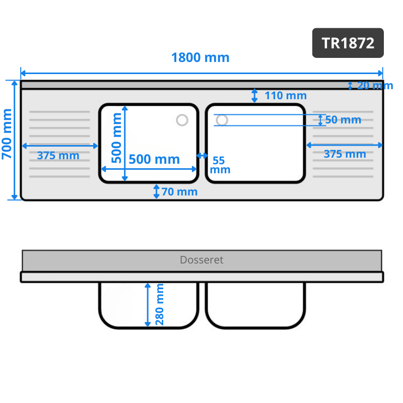 - Dimensions des cuves : 500 x 500 x 300 mm