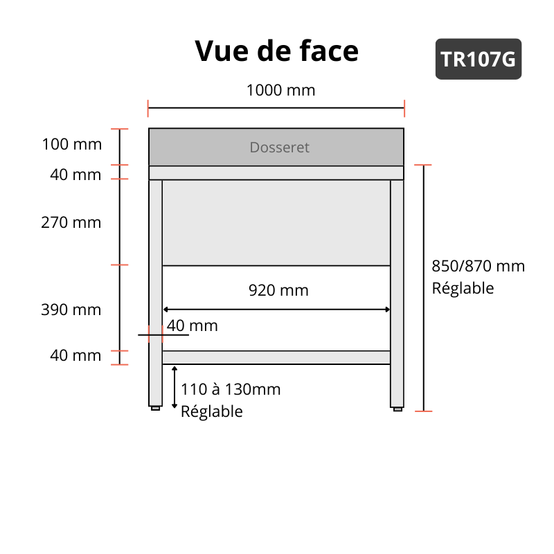- Hauteur réglable pour les pieds : 850 à 870 mm