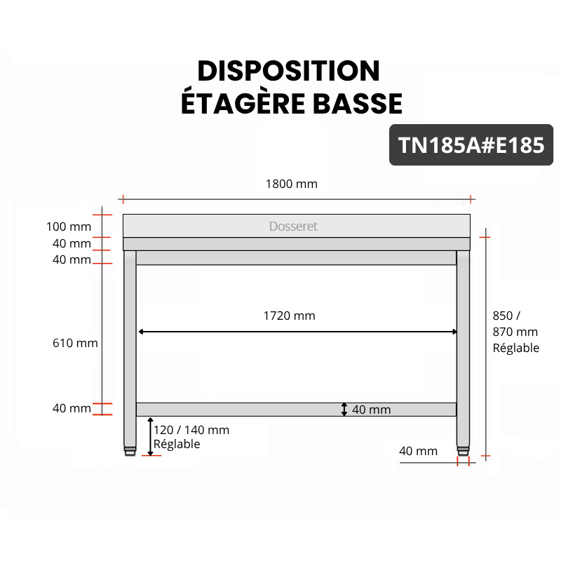 - Compatible avec toutes les tables en acier inoxydable TN185 et TN185A