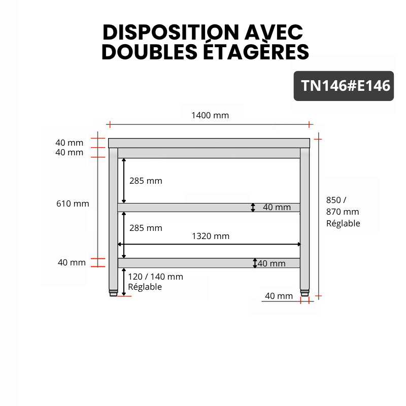 - Compatible avec toutes les tables en acier inoxydable TN146 et TN146A