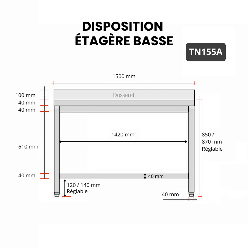 - Compatible avec toutes les tables en acier inoxydable TN155 et TN155A