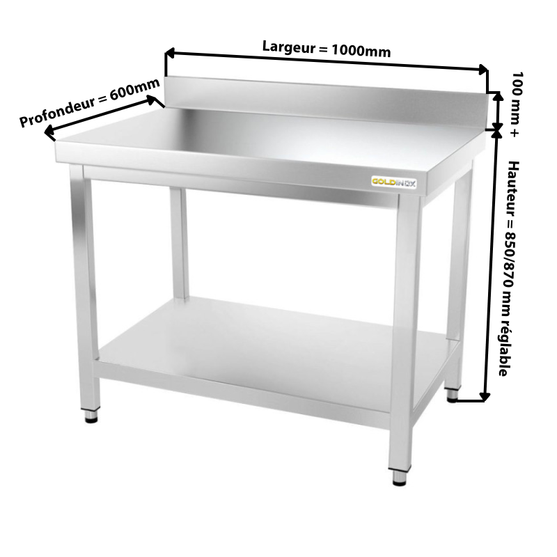 Nos tables en acier inoxydable de marque GOLDINOX® permettent un meilleur aménagement de votre cuisine. Elles sont conçues pour une utilisation intensive et supportent des charges très élevées. Nos tables inox répondent aux normes obligatoires pour le mobilier en milieu professionnel. Le montage est très simple à réaliser et nécessite peu de temps d'exécution.