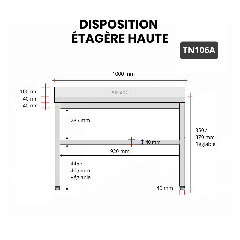- Compatible avec toutes les tables en acier inoxydable TN106 et TN106A
