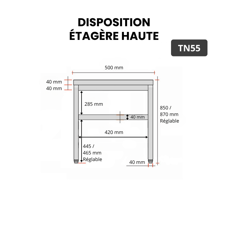 - Compatible avec toutes les tables en acier inoxydable TN55 et TN55A