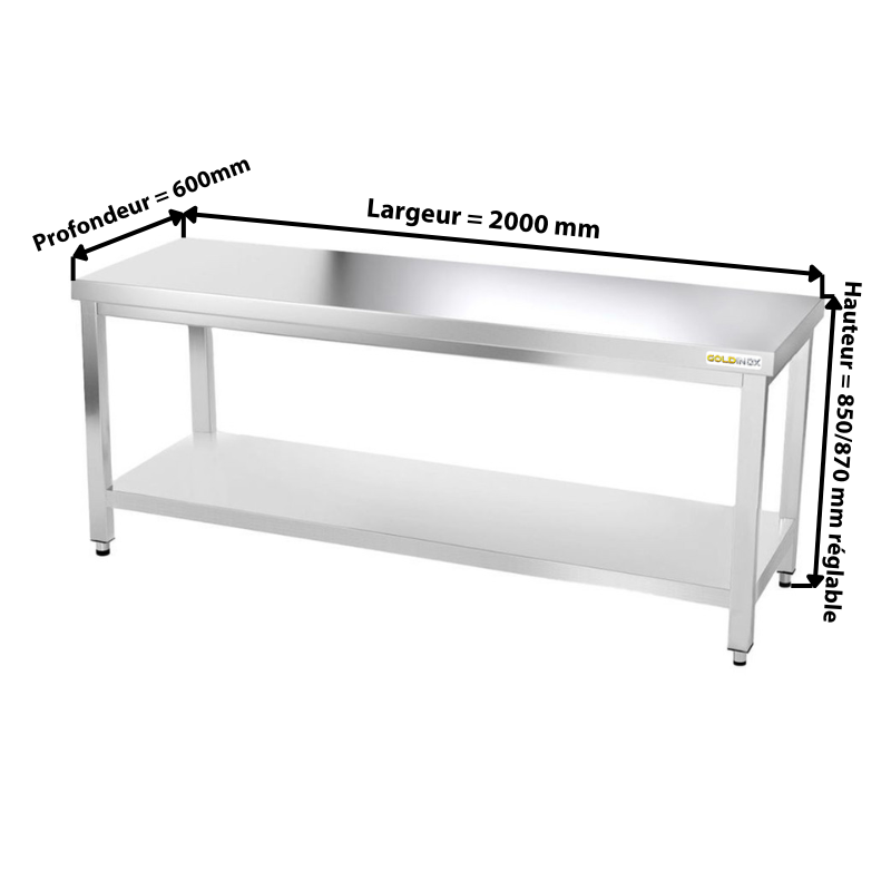 - Etagère inférieure 2000 x 600 mm en acier inoxydable pour table de travail inox