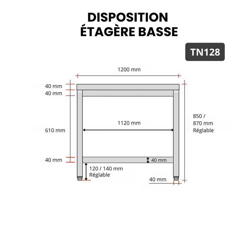 - Compatible avec toutes les tables en acier inoxydable TN128 et TN128A
