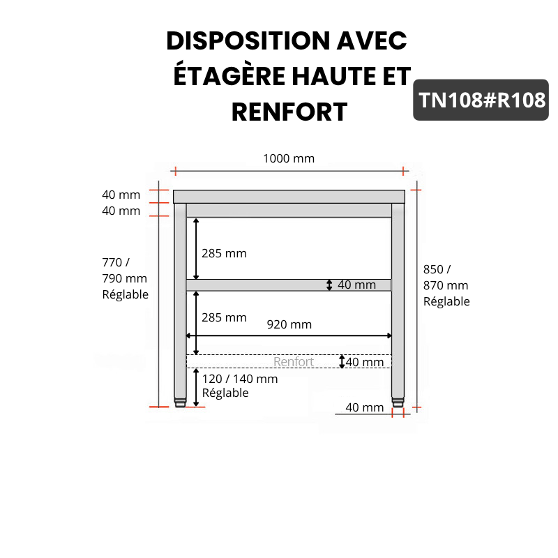 - Compatible avec toutes les tables en acier inoxydable TN108 et TN108A