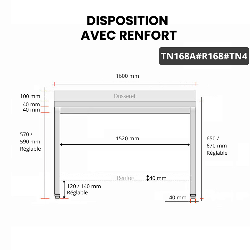- Compatible avec toutes les tables en acier inoxydable TN168 et TN168A