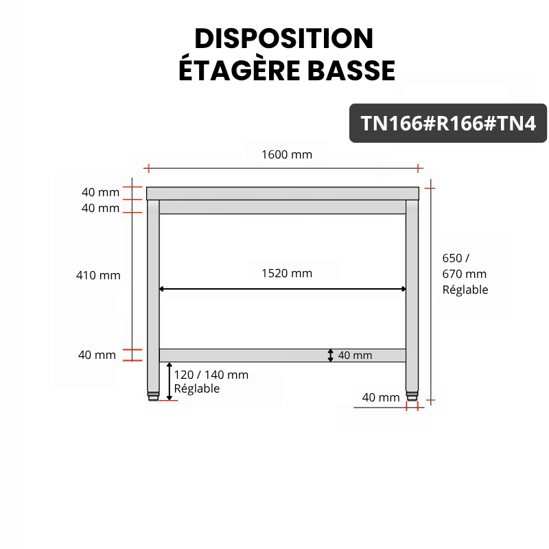 - Compatible avec toutes les tables en acier inoxydable TN166 et TN166A