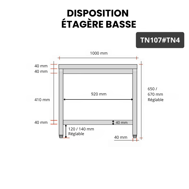- Compatible avec toutes les tables en acier inoxydable TN107 et TN107A
