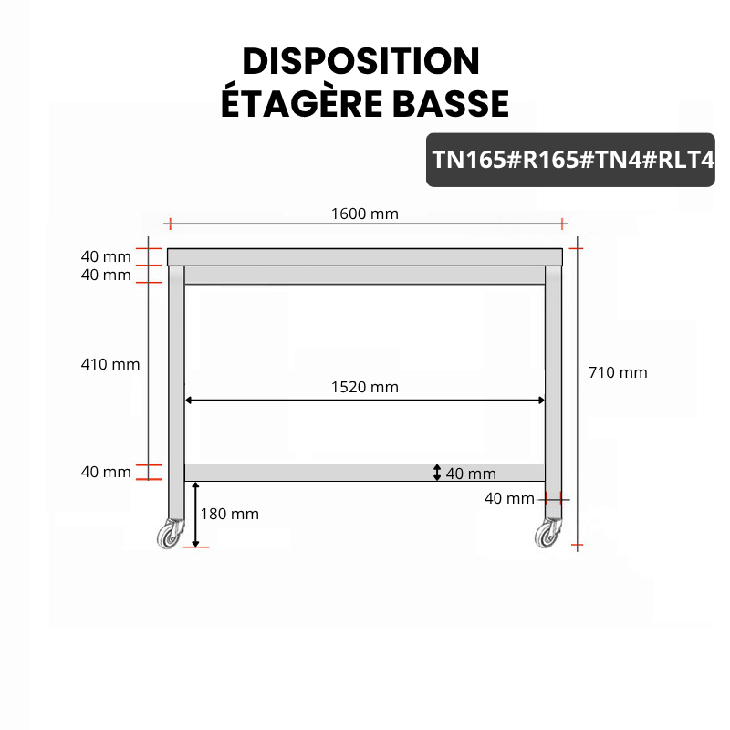 - Compatible avec toutes les tables en acier inoxydable TN165 et TN165A