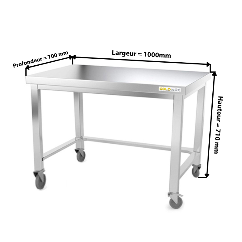 Nos tables en acier inoxydable permettent un meilleur aménagement de votre cuisine. Elles sont conçues pour une utilisation intensive et supportent des charges très élevées. Nos tables inox répondent aux normes obligatoires pour le mobilier en milieu professionnel. Le montage est très simple à réaliser et nécessite peu de temps d'exécution. Dotée de 4 roues robustes dont 2 avec freins, vous aurez alors tout le confort d'une table inox mobile, permettant un déplacement de votre matériel sans effort.