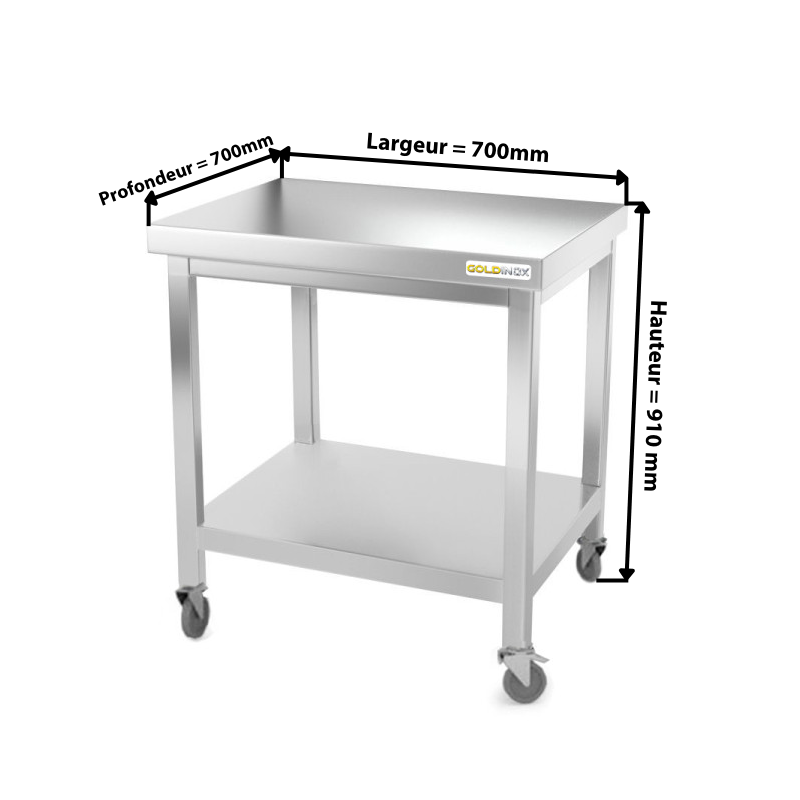 Dotée de 4 roues robustes dont 2 avec freins, vous aurez alors tout le confort d'une table inox mobile, permettant un déplacement de votre matériel sans effort.