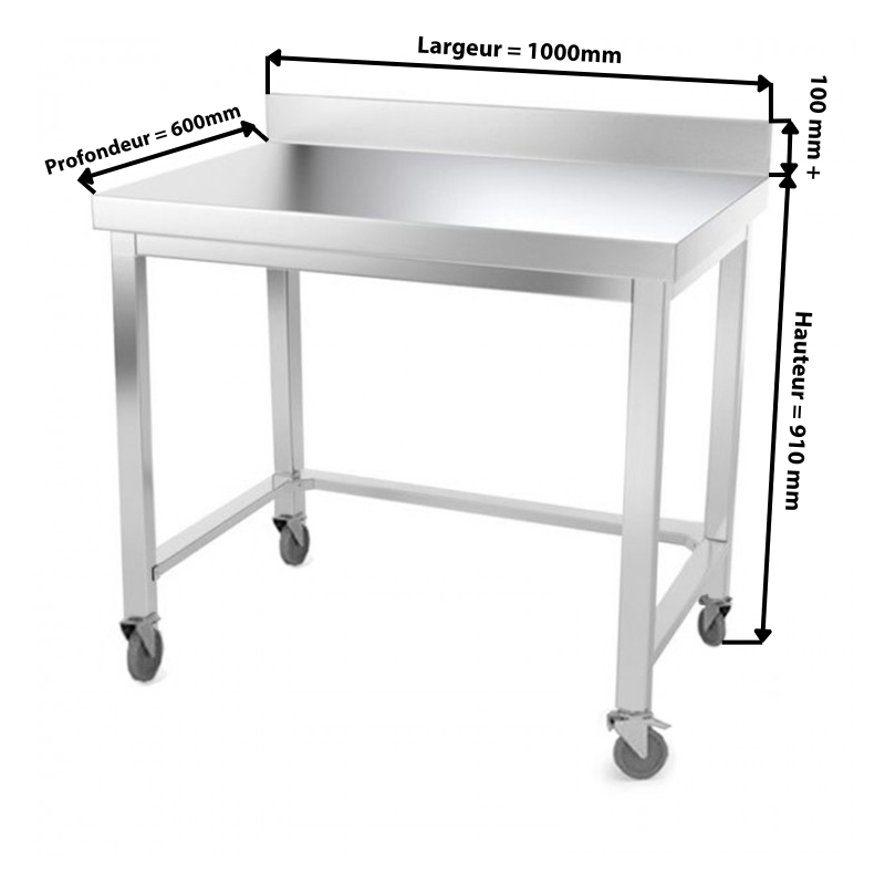 Dotée de 4 roues robustes dont 2 avec freins, vous aurez alors tout le confort d'une table inox mobile, permettant un déplacement de votre matériel sans effort.