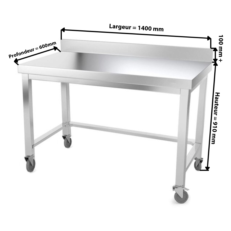 Dotée de 4 roues robustes dont 2 avec freins, vous aurez alors tout le confort d'une table inox mobile, permettant un déplacement de votre matériel sans effort.
