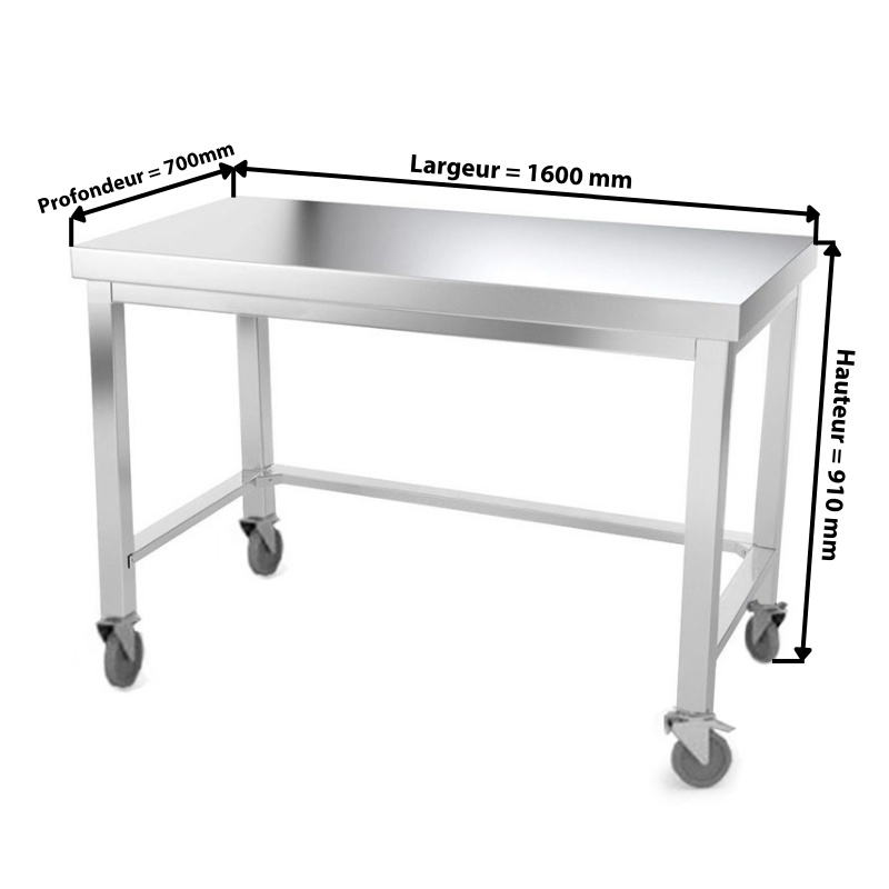 Dotée de 4 roues robustes dont 2 avec freins, vous aurez alors tout le confort d'une table inox mobile, permettant un déplacement de votre matériel sans effort.